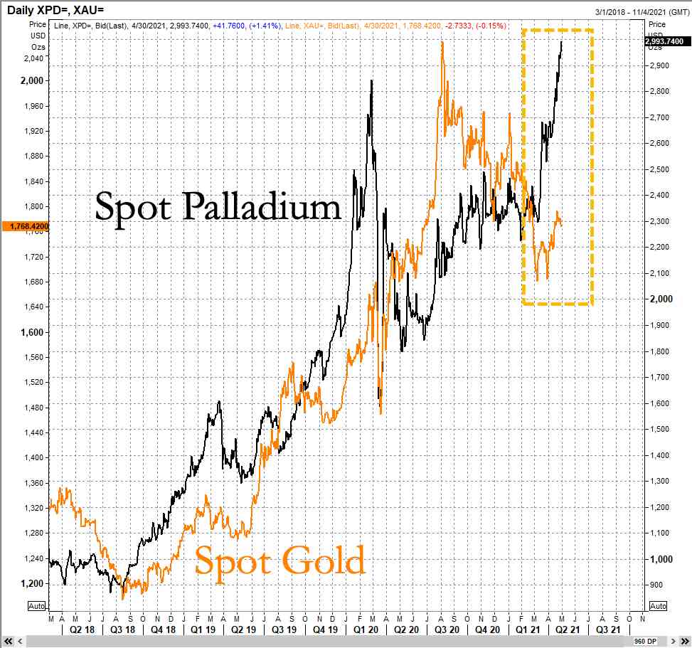 NYMEX 6月钯金期货周五当天收报2953.7美元/盎司,继续本周一和周二之后再创收盘新高,全周涨超3%,4月一个月涨近15%,涨幅遥遥领先其他贵金属和铜等工业金属。