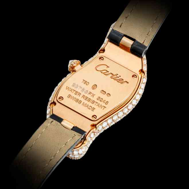 这枚为卡地亚18K红金镶钻石不对称女装腕表,BAIGNOIRE S,型号3248,约2009年制,附原厂证书、盒子及外包装。