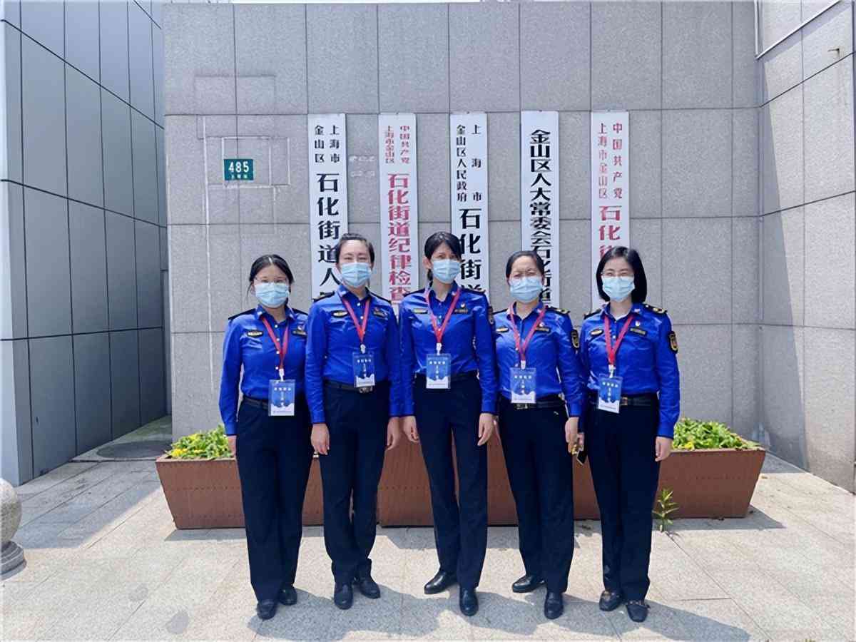图说:金山区城管执法局“蓝凤凰”女子突击队入驻石化街道参与志愿服务(左三为张虹怡)