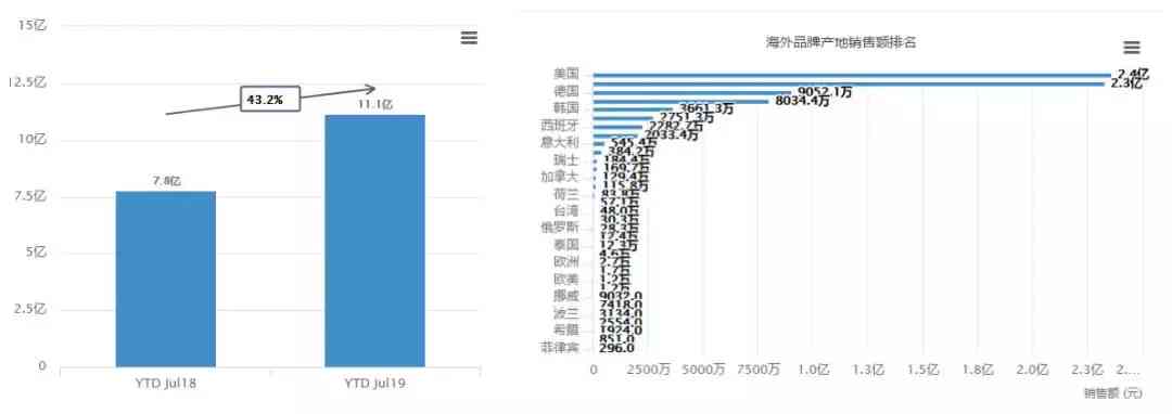 据Ecdataway数据威的数据显示,2019年1-7月,婴儿护肤线上销售额达11.1亿,同期增长43.2%。其中12.1%的头部产地贡献了83.6%的海外品牌销售额,美国、日本更是以2.4亿和2.3亿的销售额处于绝对领先地位。