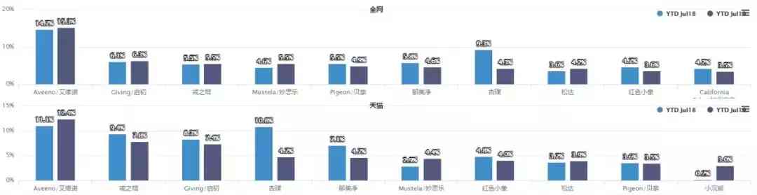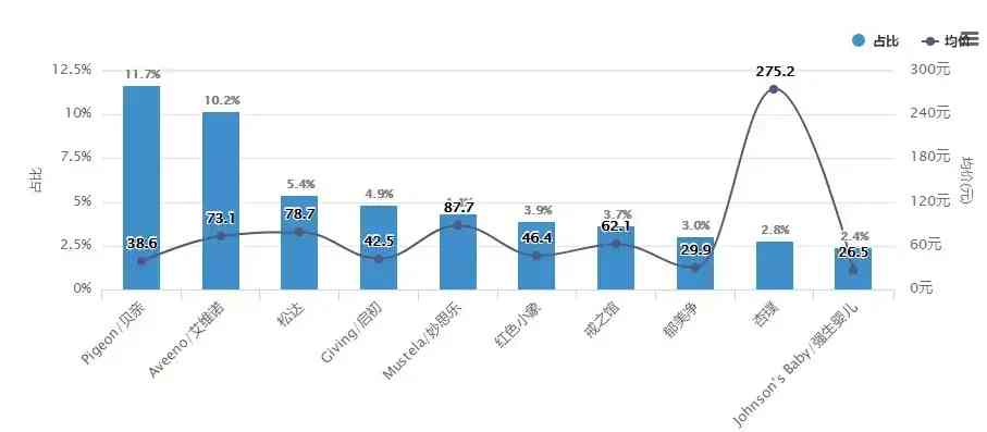 众所周知,美国有着全球规模最大的卫生保健产品制造商、健康服务提供商——强生公司,强生旗下的婴儿护肤品牌有艾维诺、强生婴儿等。从品牌监测情况来看,艾维诺、强生婴儿都是TOP10品牌,其中艾维诺销售额达1.1亿,市场占比10.2%,在天猫平台上更是达到了量价齐升的态势。强生婴儿虽然份额只有2.4%,但在天猫上销量已冲到第七位。