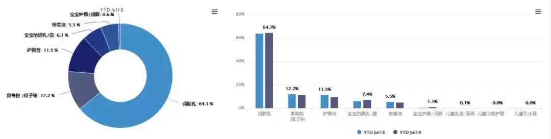 婴儿护肤产品包括润肤乳、爽身粉、护臀膏、防晒乳、按摩油、护唇膏、面霜等七个类目。考虑到婴儿的皮肤很娇嫩,又容易出现问题,需要精心呵护,所以润肤乳最受妈妈们欢迎,市场占比64.1%,同期增长0.6%,远超于其他类目。