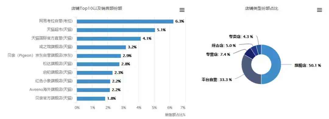 从婴儿护肤品店铺销售情况可以看到,主要销售额来自旗舰店和自营店,其中旗舰店占比50.1%,平台自营占比33.3%。TOP10店铺中网易考拉自营(考拉)份额最高,达 6.3%。可见,消费者购物时不论是价格还是渠道,都更看重商品的安全性和专业性。