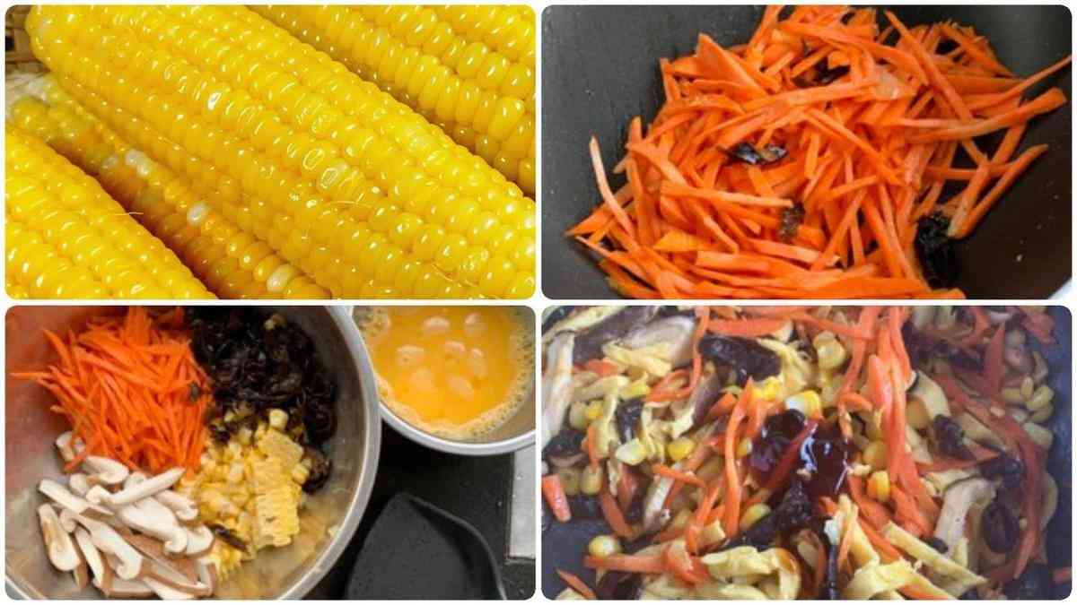 2.炒熟。我们先把胡萝卜丝放到锅里炒个半熟,再依次加入木耳、蘑菇、玉米、鸡蛋,炒熟,加入食盐、蚝油。