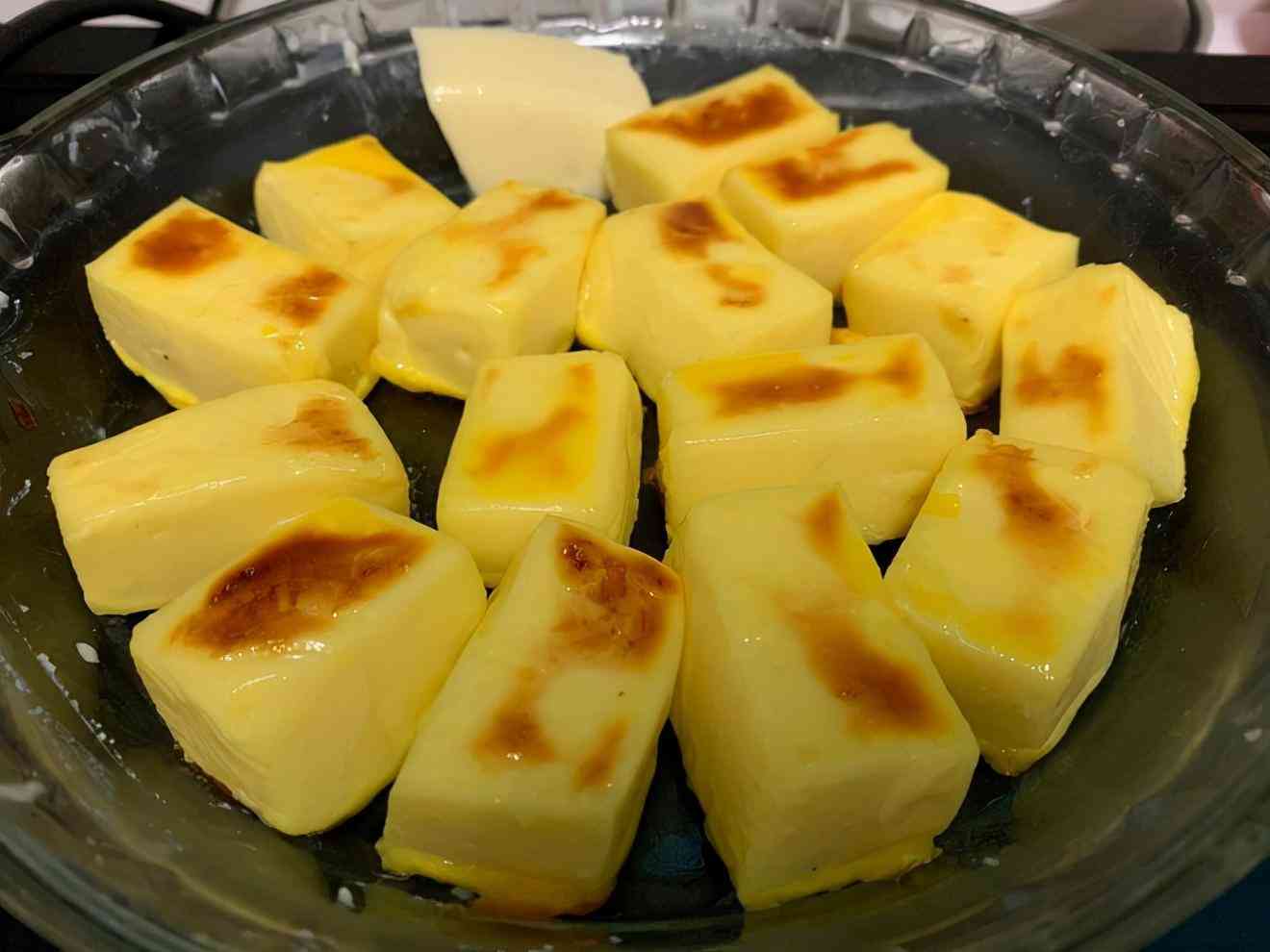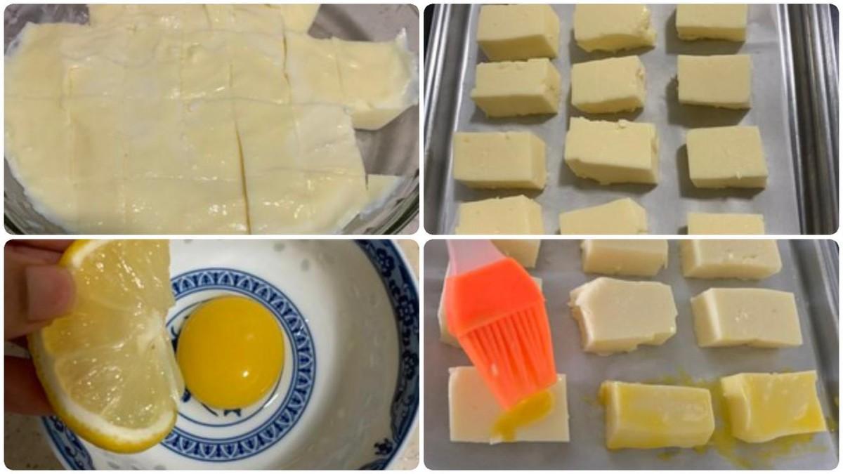 6.把柠檬榨成汁,和蛋黄液一起刷在奶酪上面,放入烤箱,中小火15分钟左右就可以出炉了。