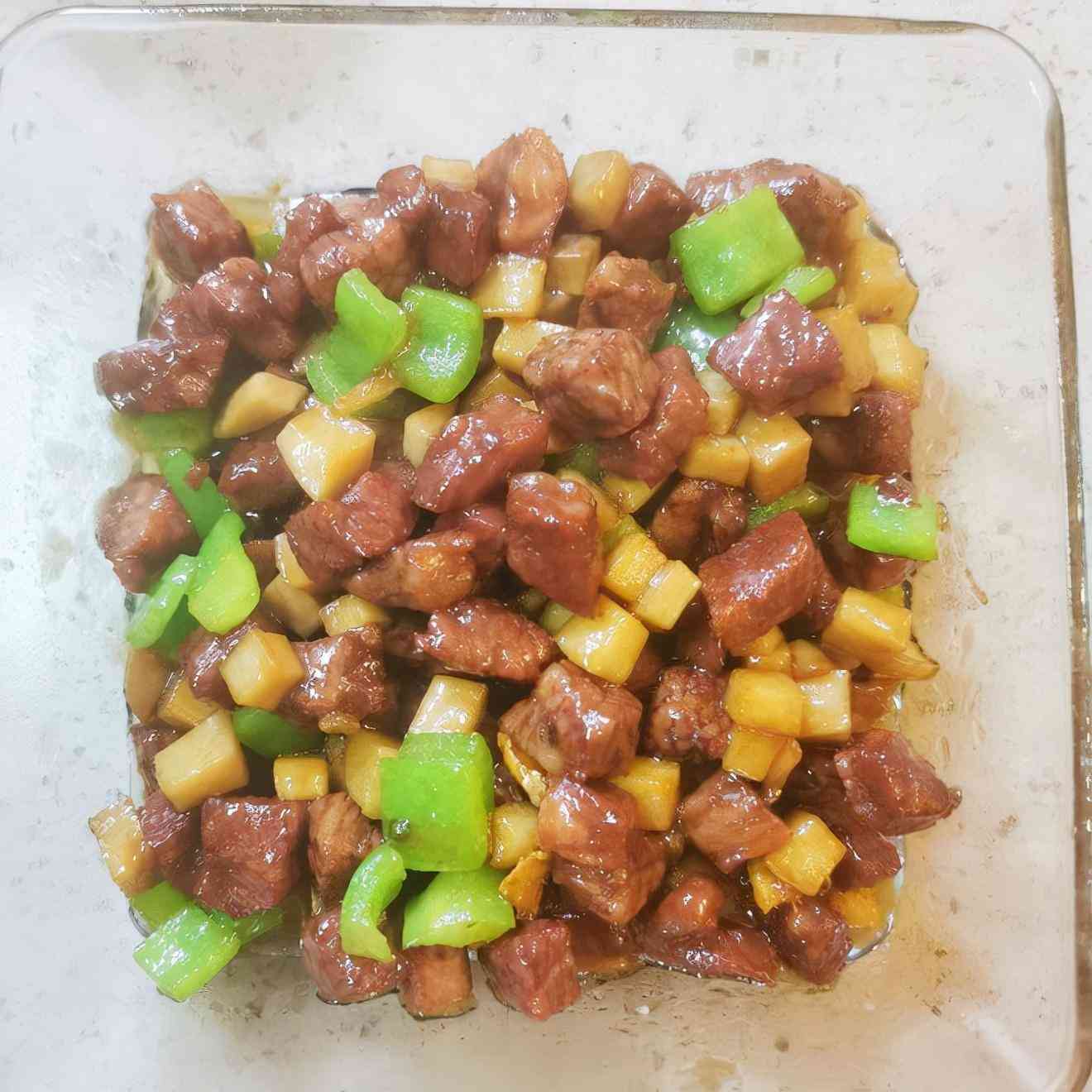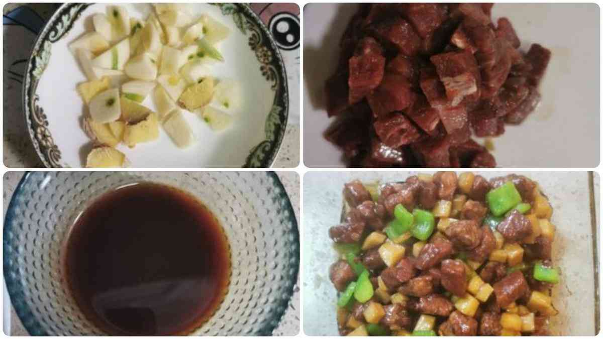 2.牛肉选用新鲜的熟牛肉,切成小粒,或者给儿童吃的牛肉粒都可以;青椒,我们选不辣的,切成小块。