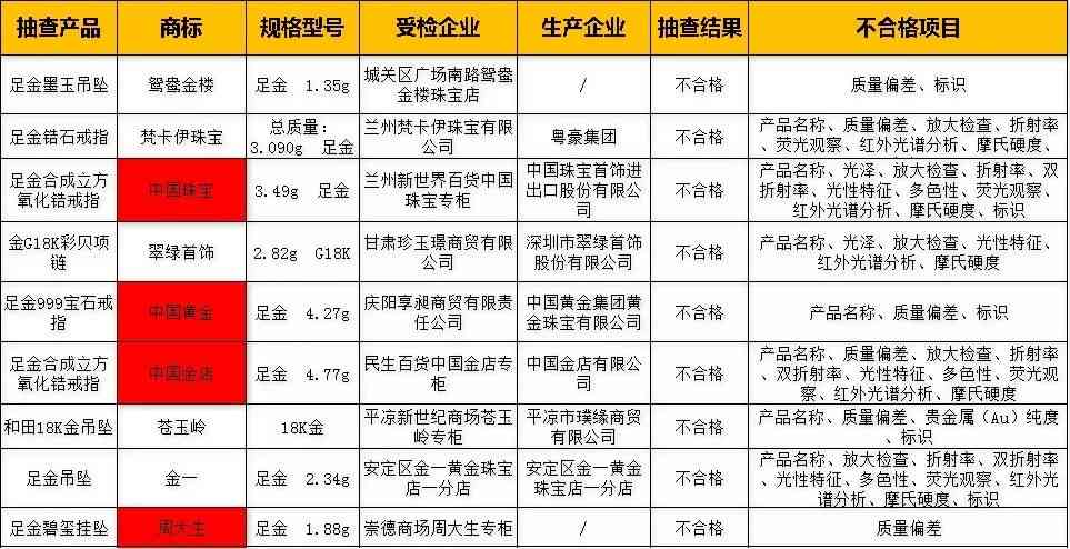 近日,甘肃省市场监督管理局发布“关于甘肃省2019年第2批工业产品质量省级监督抽查结果通报”,本次监督抽查了251家企业的362批次产品,其中抽检50批次贵金属首饰及制品,9批次不合格,其中周大生、中国黄金、中国珠宝、中国金店等品牌上榜。