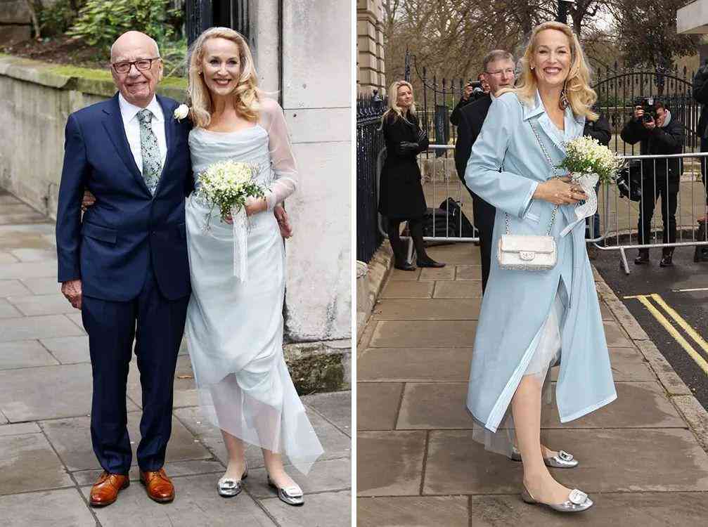 和默多克结婚时,她的Vivienne Westwood蓝色连衣裙也很美。既有婚纱的隆重,廓形也很轻松随意,搭配同色系长外套,以及Roger Vivier平底鞋、Chanel包包,非常抢镜。