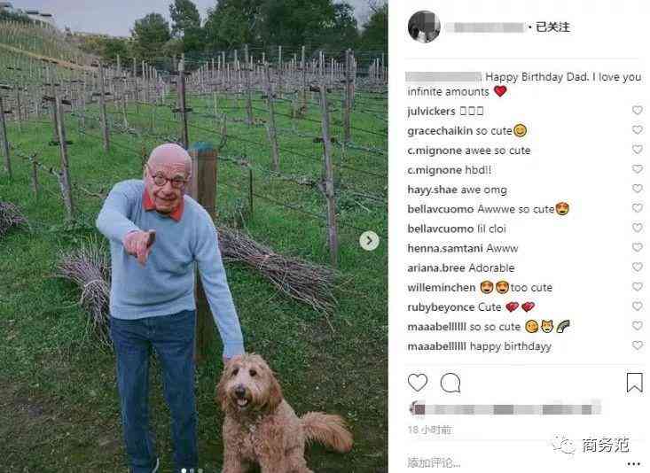 每年默多克过生日,或是父亲节,姐妹俩都会定点发祝福。比如会配上一张默多克的照片,以及"爸爸生日快乐,爱你无限量”的配文。