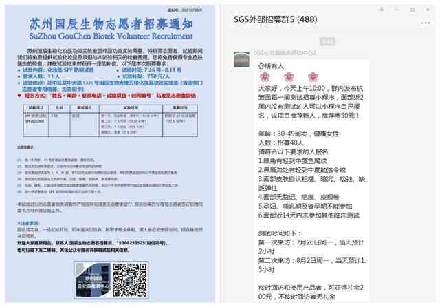 ▍苏州国辰生物志愿者招募通知(左图)和SGS志愿者招募群发布的招募信息(右图)