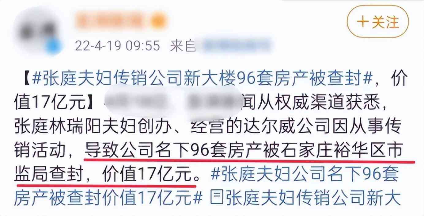 早在今年4月份,张庭林瑞阳夫妇创办经营的达尔威公司因涉嫌从事传销活动,导致公司名下96套房产被查封,价值17亿元。