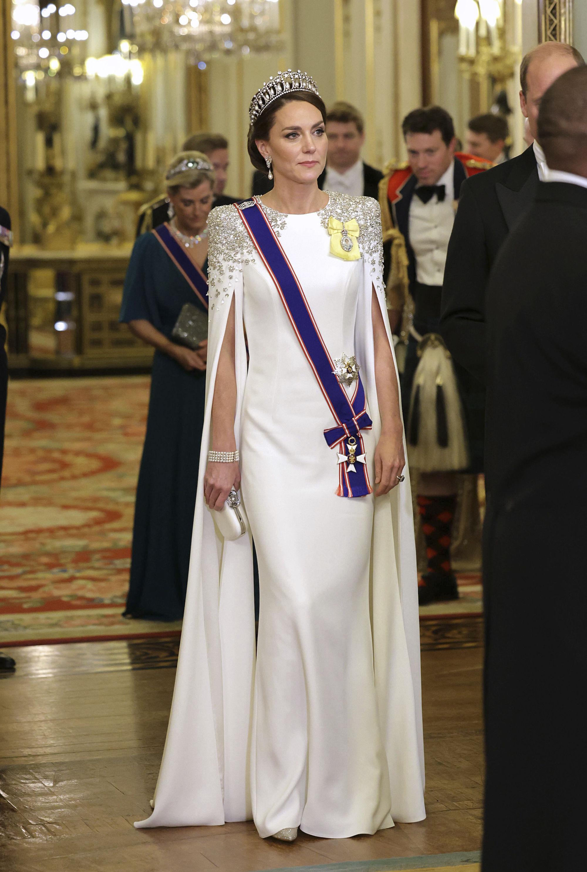 2022年南非-英国的国宴上,威尔士王妃凯瑟琳(下文凯特王妃)一身JennyPackham白色斗篷式长礼服,佩戴着戴安娜王妃钟爱的“珍珠泪”王冠&私有的南海珍珠耳环、女王的四排珍珠手链,以及她自己购入的装饰艺术风格胸针亮相。