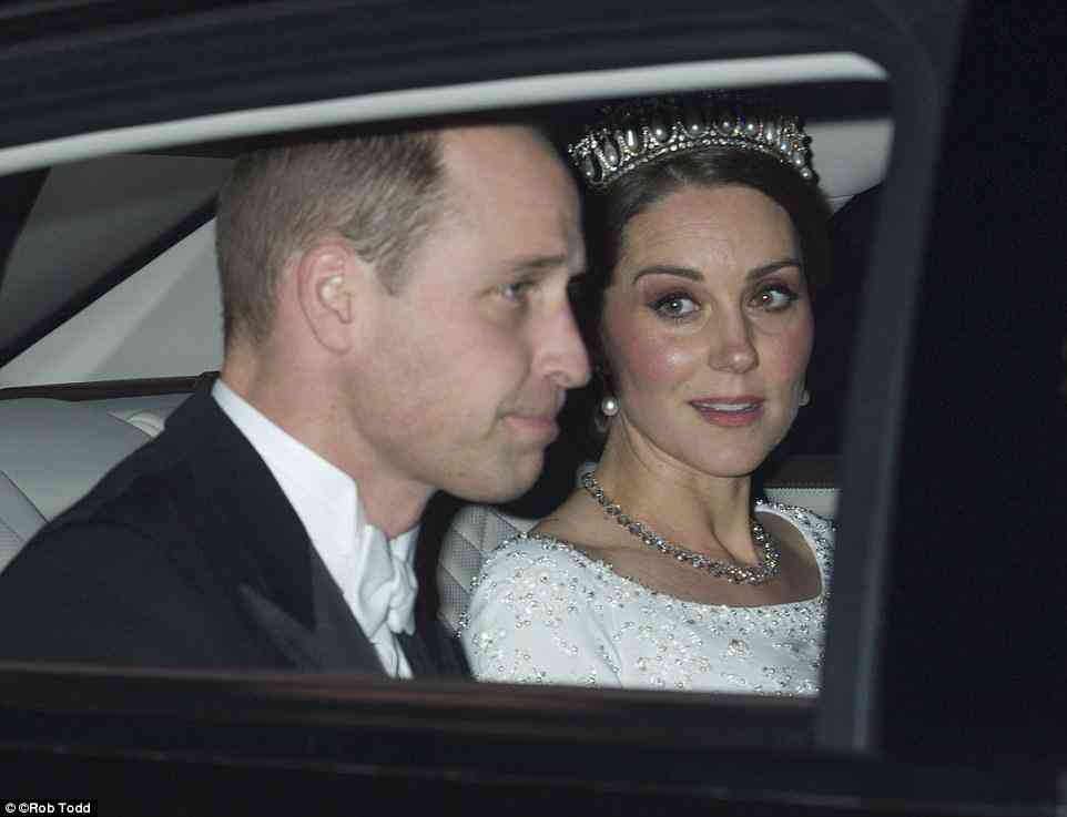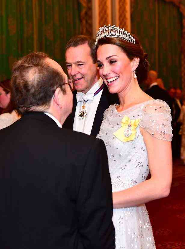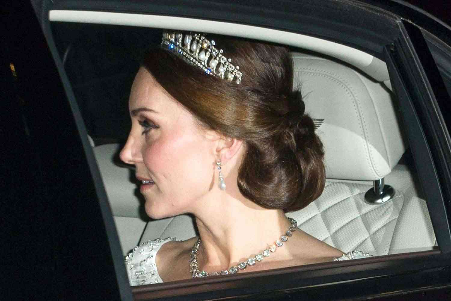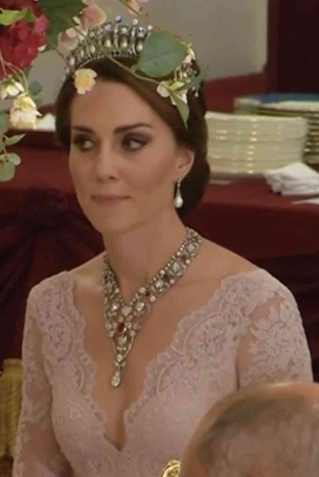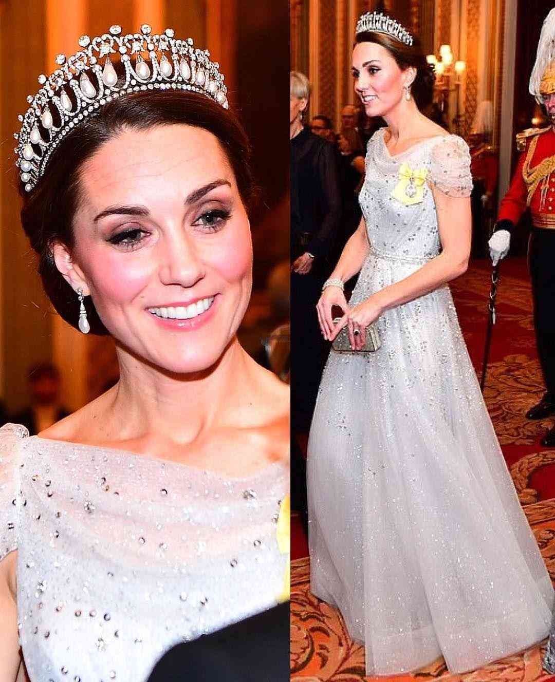 四件不同来历的珠宝,会和后出现在同一个女人的身上,本身就是一件浪漫而美丽的事情,更让人惊喜的是,在2019年的外交招待会上,凯特王冠选择了另外一种“珍珠泪”搭配方式。