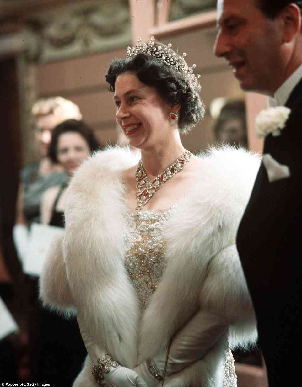 配的蓝宝石流苏耳环来自伊丽莎白王太后,绶带上的橡果胸针据说是父母赠送的。佩戴的四层珍珠手链则是女王的收藏。