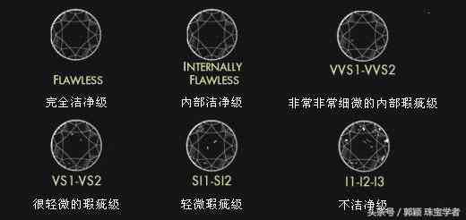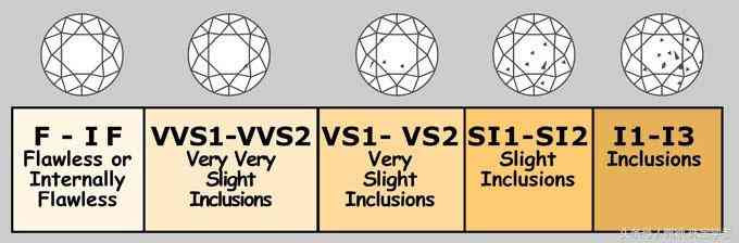 天然钻石内部或多或少会含有一些包裹体、杂质、裂隙等,这些都是影响钻石净度的主要原因。钻石净度级别从高到低依次为LC(FL、IF)、VVS(VVS1、VVS2)、VS(VS1、VS2)、SI(SI1、SI2)、I(I1、I2、I3)等,共5大级11小级。钻石净度级别以10倍放大镜观察为准,但日常佩戴中肉眼下看到不净度特征就可接受,因此建议选择VS级以上就可以,虽有杂质但肉眼不可见,如此级别性价比更高。