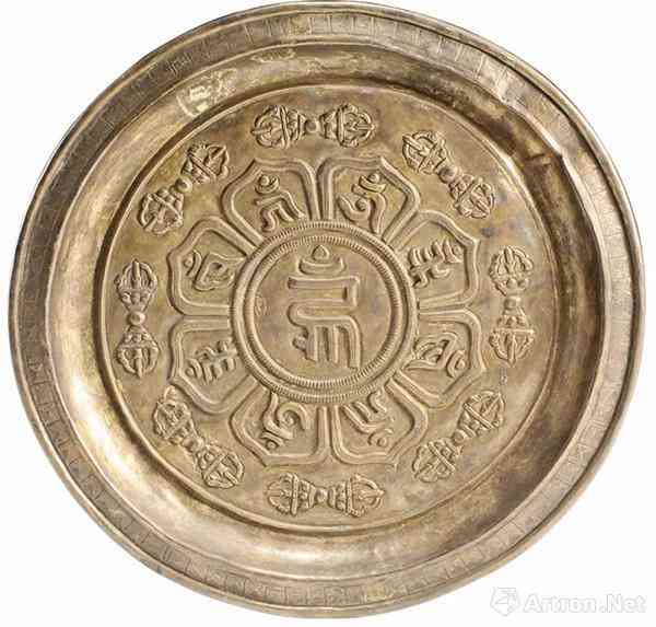 银盘 高1.2厘米,口径16.8厘米,底径13.8厘米。内里铸梵文种子字和金刚杵
