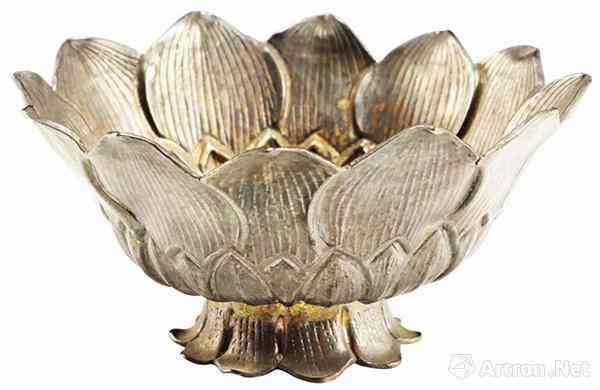 莲花形银盏 整体为莲花形,高4.6厘米,口径8.7厘米,底径3.9厘米。十二曲菱花形口