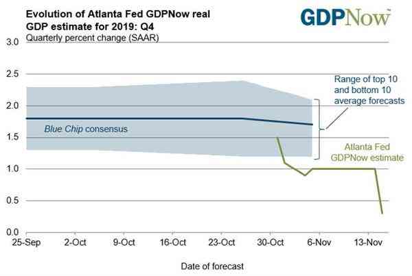 事实上,亚特兰大联邦GDPNow模型预测,美国经济在2019年第四季度增长0.3%,11月8日这一数值为1%,因此,在总统唐纳德.特朗普毫无意图撤销关税的情况下,美联储主席杰罗姆.鲍威尔和他的同事可能敞开实施低利率的大门。