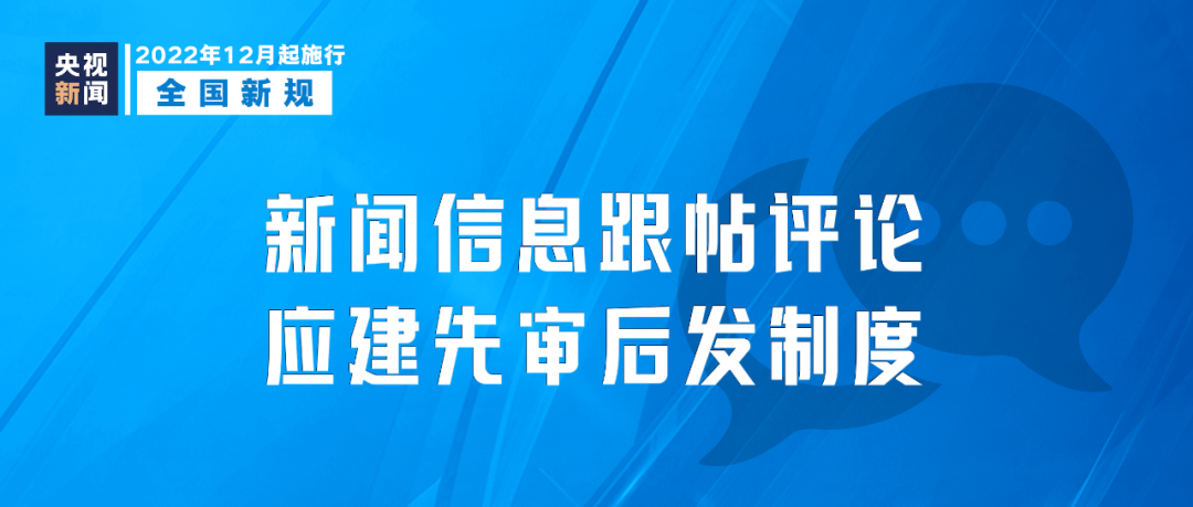 新修订的《互联网跟帖评论服务管理规定》12月15日起施行,明确跟帖评论服务提供者应当按照用户服务协议对跟帖评论服务使用者和公众账号生产运营者进行规范管理,对新闻信息提供跟帖评论服务的,应当建立先审后发制度。