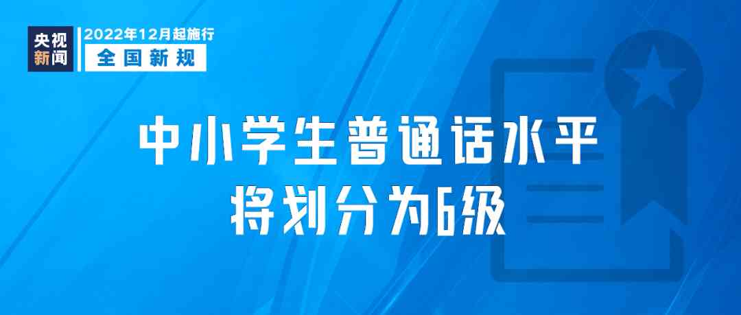 《中小学生普通话水平测试等级标准及测试大纲》12月15日起试行,中小学生的普通话水平将划分为6级,适用于义务教育阶段小学五年级及以上学生普通话水平的测评或评估监测。