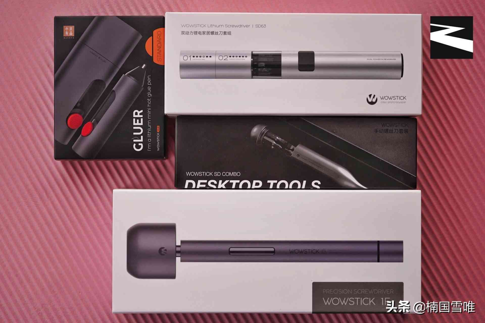 WOWSTICK 四件套礼包,都包含:电动螺丝刀 1F+、SD 双动力锂电家居螺丝刀套组、手动螺丝刀套装、锂电迷你热熔胶笔;