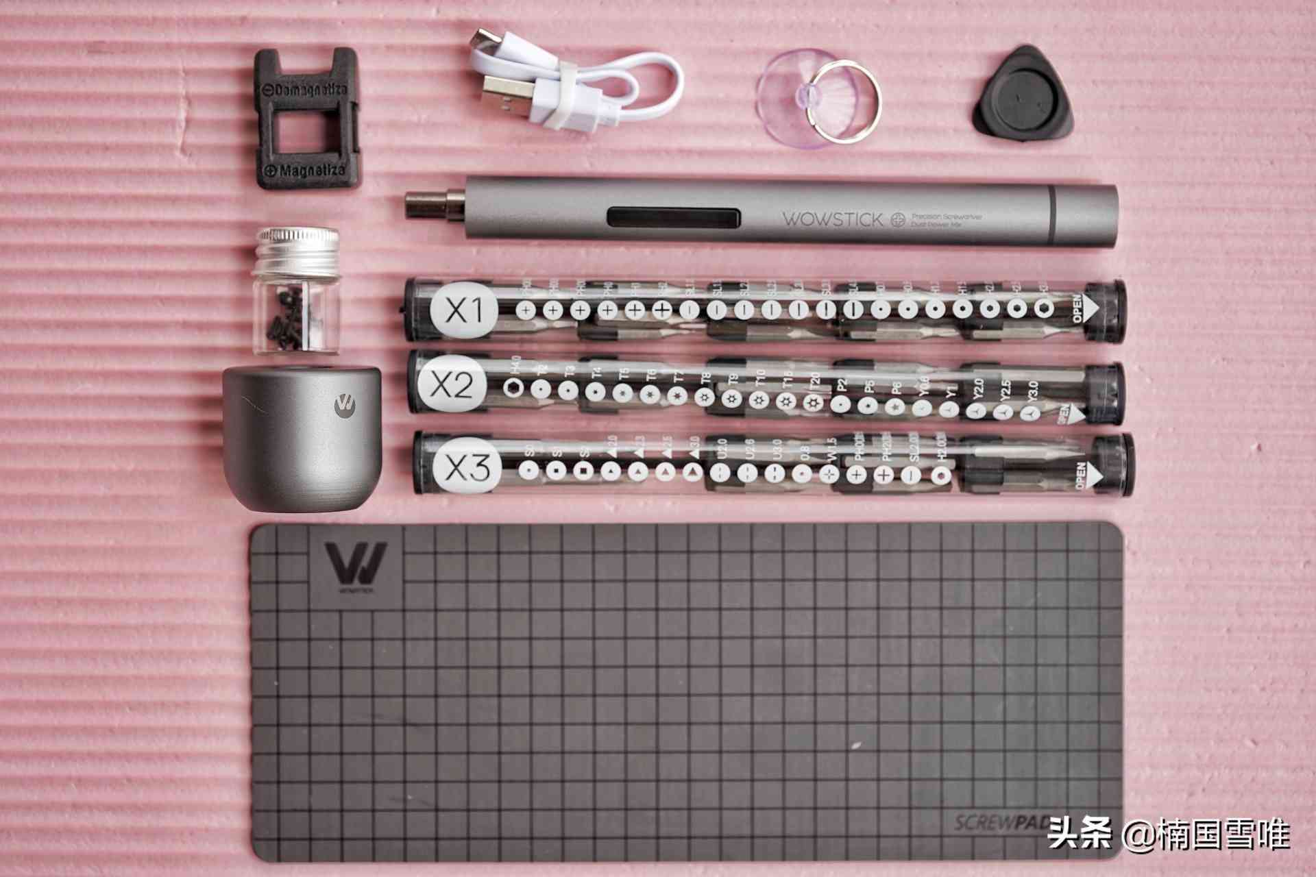 全家福:WOWSTICK 1F+精修迷你电动螺丝刀、三管共52个C4标准批头、小吸盘、三角拨片/翘片、螺钉瓶、加/消磁器、磁性定位板、便携收纳盒、桌面底座、充电线;整整65个配件放在一个小盒子里,真的是强大MAX;