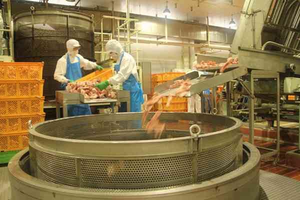 在拥有45年历史的味千中央大厨房,几名“全副武装”的工人在将新鲜的猪骨送入生产线。