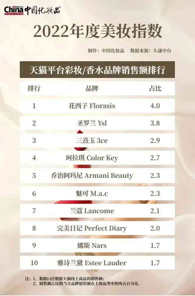 具体来看,2022年天猫彩妆/香水销售额排行榜中,花西子以占比4.0%的成绩登顶榜首,此外,珂拉琪Color Key、完美日记二国产品牌位列第4、第8,占比分别是2.7%与2.0%。