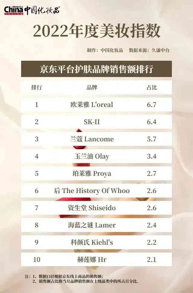 雅诗兰黛集团下,也有雅诗兰黛 Estee Lauder、海蓝之谜 Lamer二品牌进榜,分别占比3.0%、1.7%;而宝洁旗下的玉兰油 Olay、SK-II,分别占比2.8%、2.1%;此外,还有资生堂 Shiseido占比1.9%。