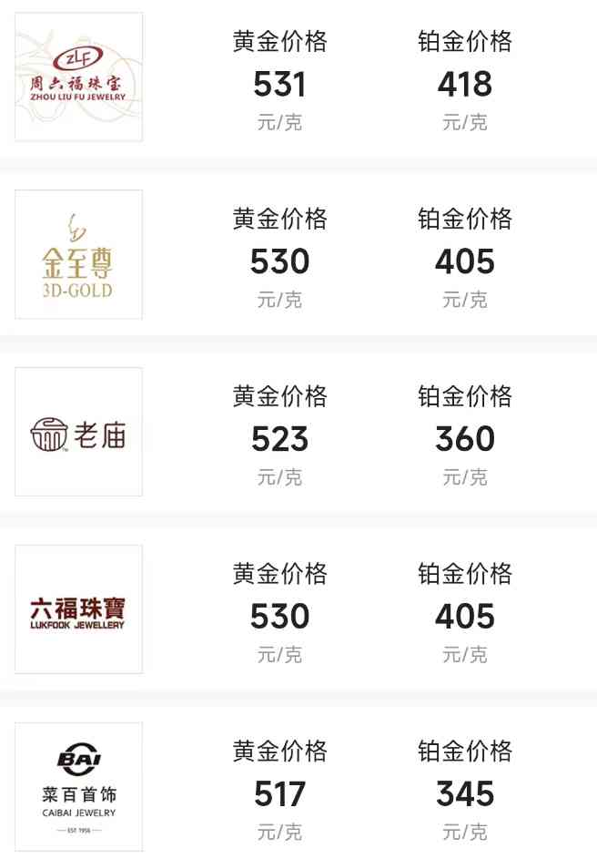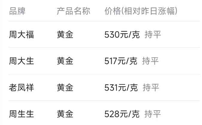 受此影响,国内各大金店金价出现调整,目前,金价最高的还是周六福、老凤祥,报价531元/克。金价最低还是菜百,报价517元/克,保持不变。