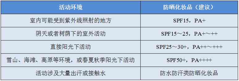 因此,应根据环境条件选用防晒产品,具体情况可参考下表: