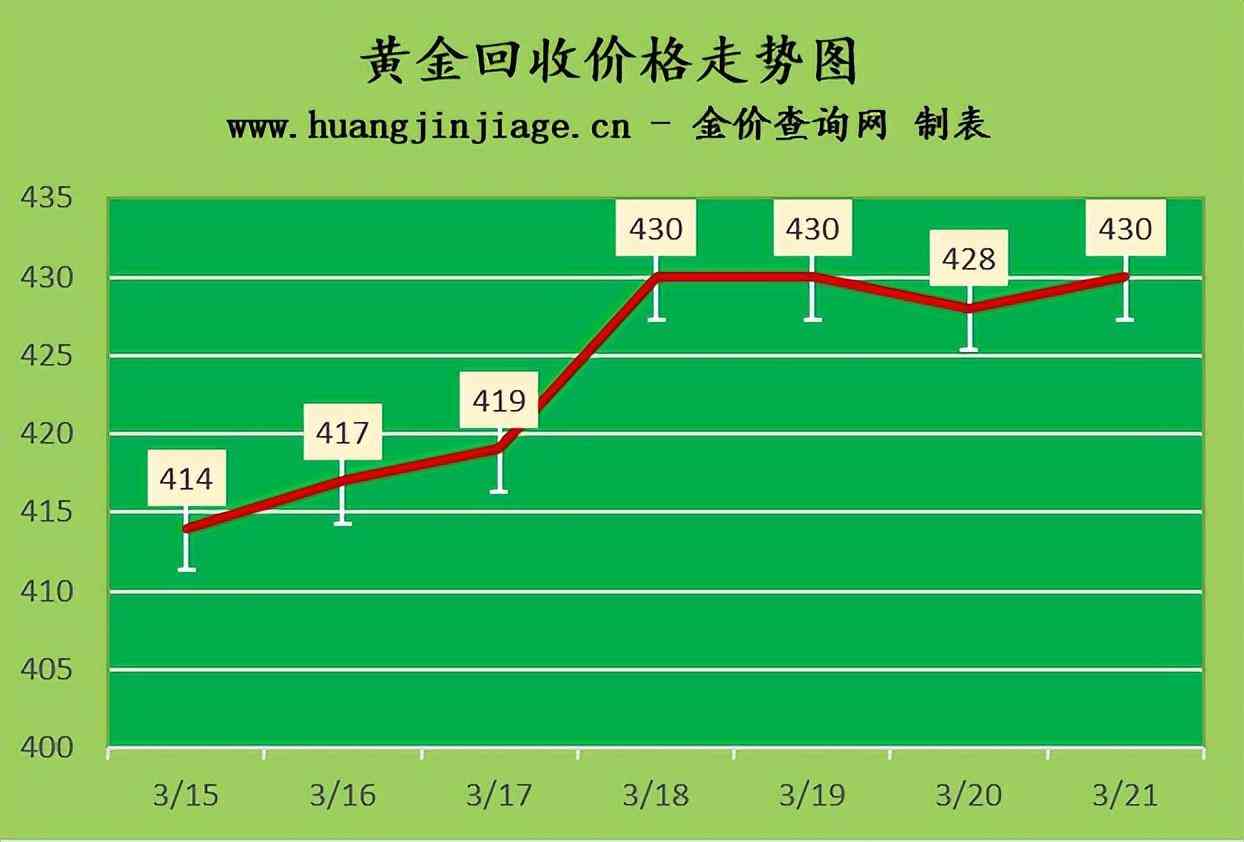 黄金回收价格430元/克,铂金回收价格190元/克,钯金回收价格288元/克,18K金回收价格310元/克,银条回收价格3.6元/克。(黄金行情是波动的,回收金价没有固定标准。)