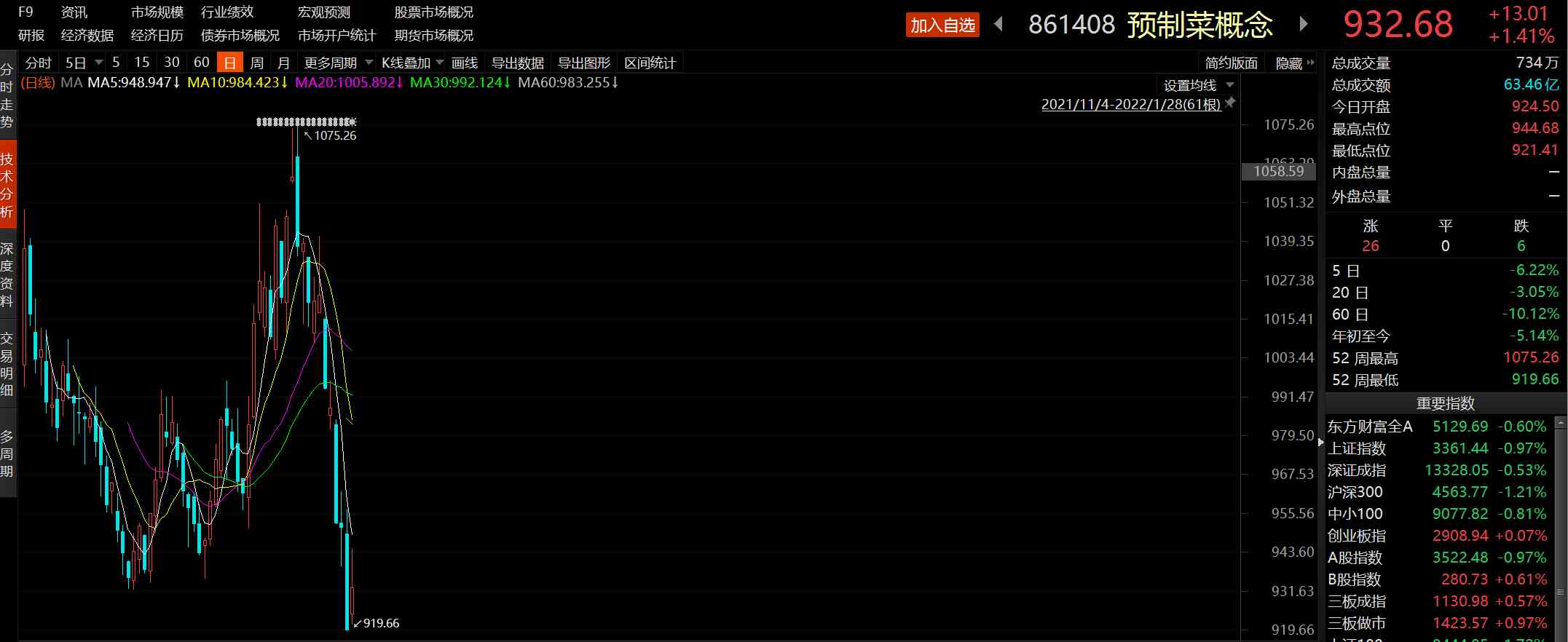 目前,从指数来看,预制菜概念板块行情已然开始回落,从1月13日的1059.69点,降至1月28日的932.68点。