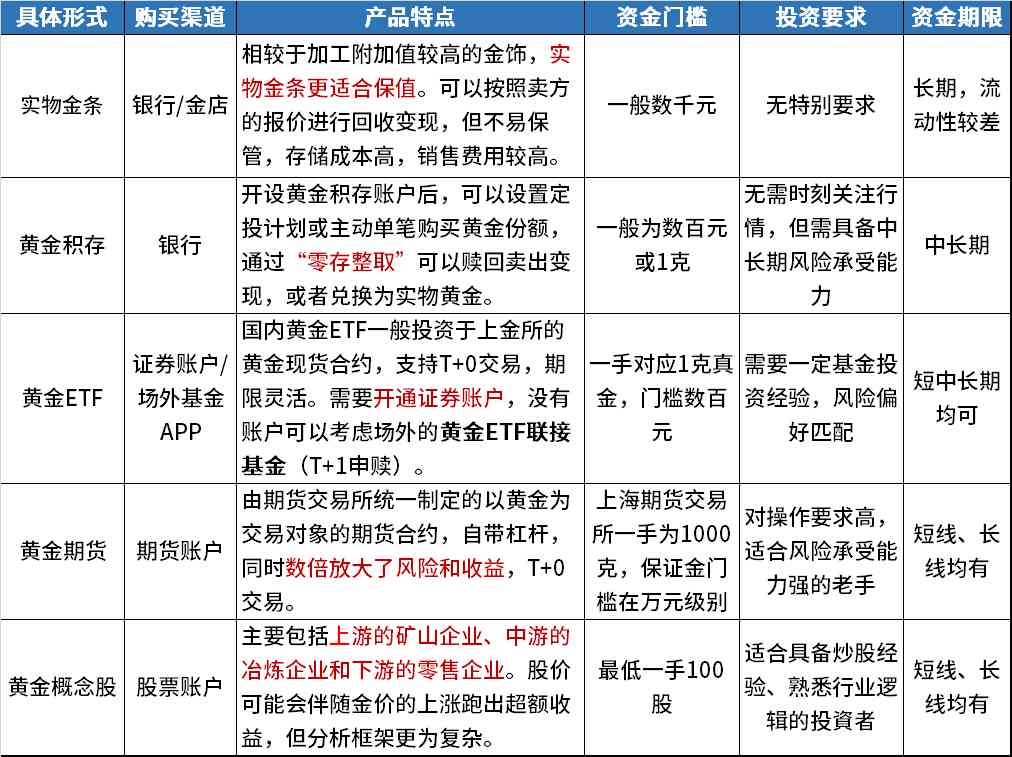 ③黄金期货:由期货交易所统一制定的以黄金为交易对象的期货合约,T+0交易,由于自带杠杆,同时数倍放大了风险和收益,对操作要求高,适合具备投资经验且风险承受能力较强的投资者。