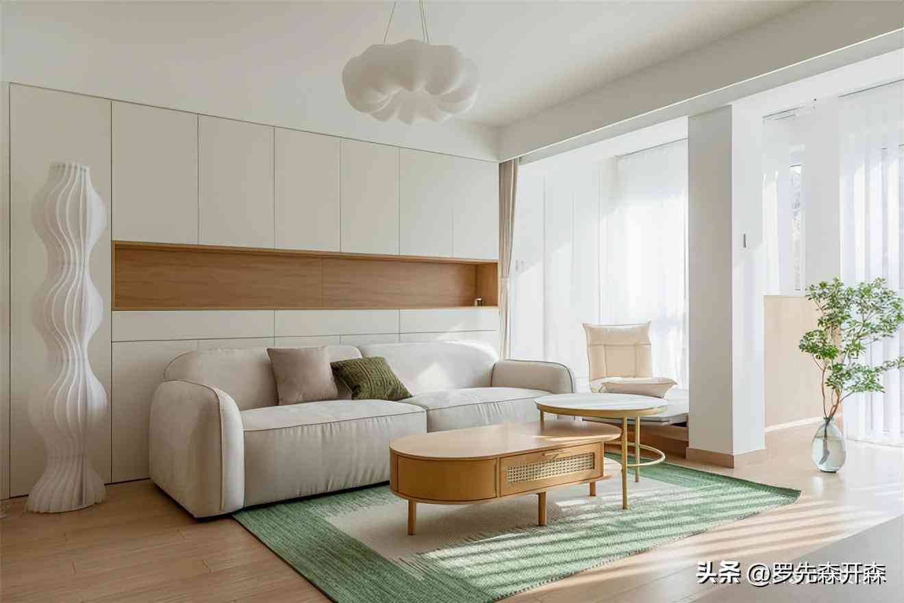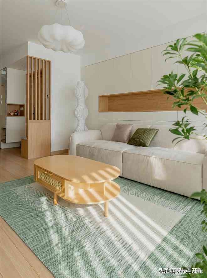 利用客厅进深长的优势,沙发背景墙满铺高柜,为整屋储备了海量的储物空间,面临后期家庭成员结构的升级,依然游刃有余。木艺藤编茶几、大尺寸的绿色羊毛地毯和厚实松软的豆腐块沙发,共同构筑了客厅慵懒舒适的生活场景,让人一眼沉沦。#客厅 #沙发背景墙 #沙发