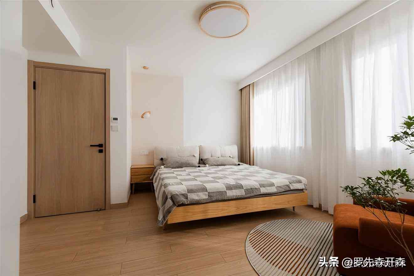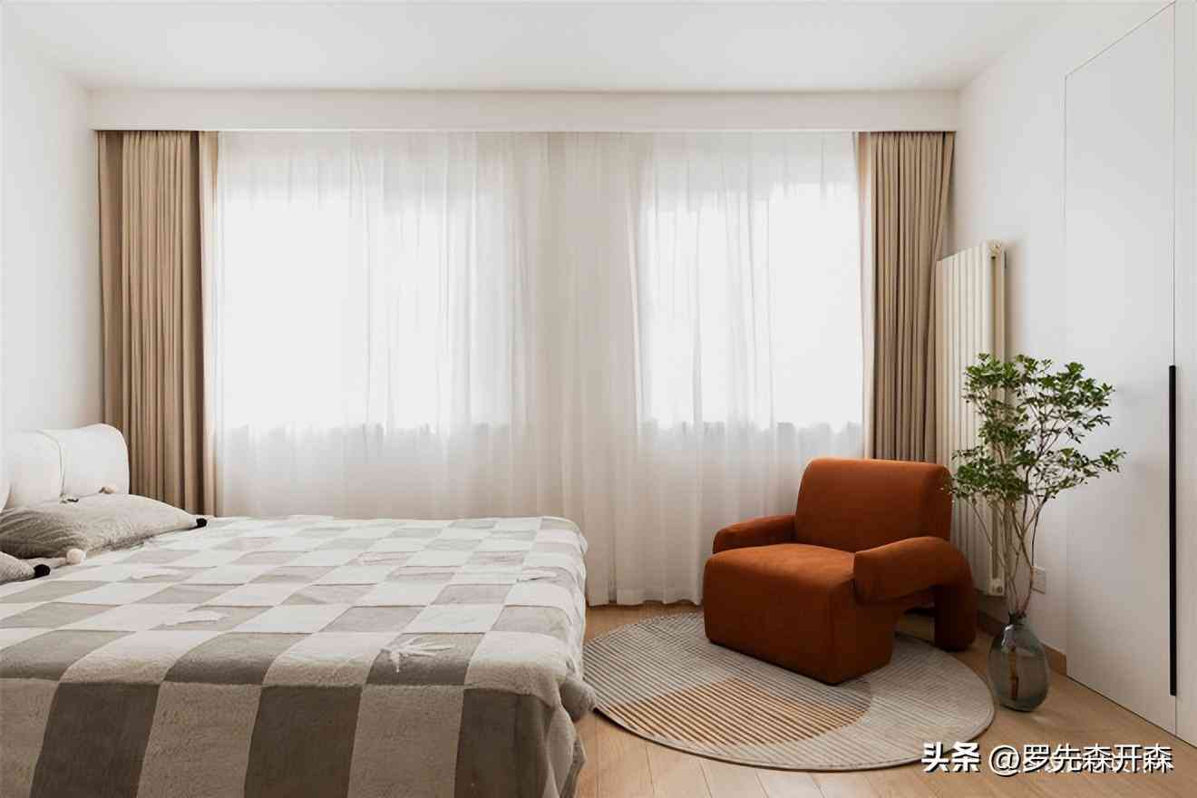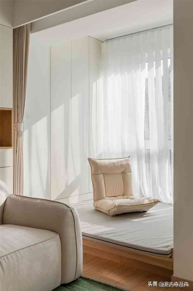 主卧严重异形,所幸室内采光优越,我们打开思路,墙面以纯白的形式呈现,软装以小范围的焦糖色、奶茶色做跳色,配合精选的轻体积家具,营造一种相对轻松闲适的氛围感。#主卧 #床 #沙发