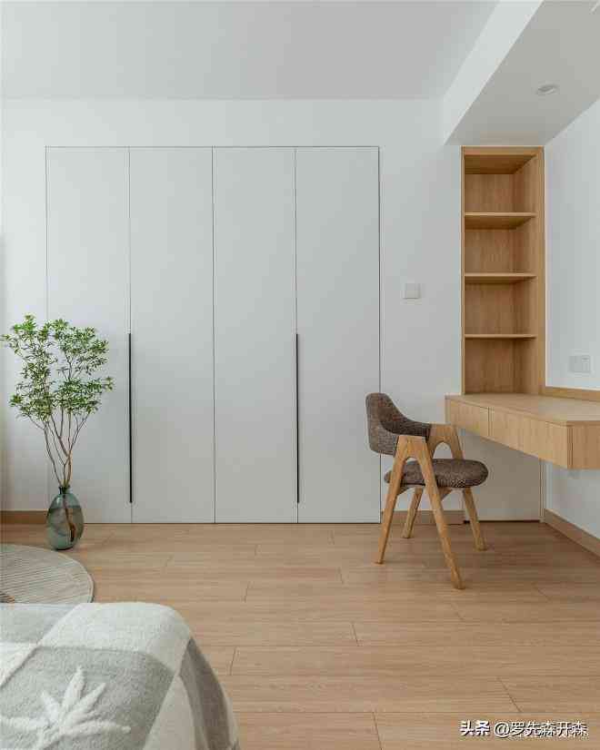 主卧空间畸零的部分,借助大开大合的折叠柜门,隔断出开阔的步入式衣帽间,解决了繁琐的衣物收纳困扰之余,通顶柜门重新切割了室内比例,让主卧归于方正规整,空间的消极感消失无踪。#主卧 #衣帽间 #折叠柜门
