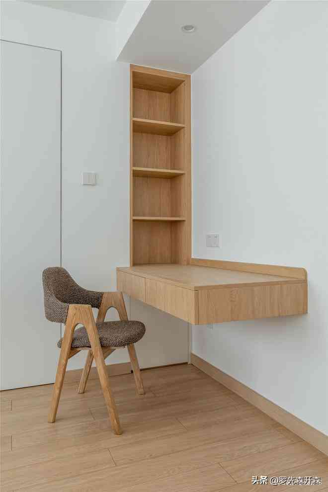 紧邻衣帽间处,设有一张悬浮的桌案和与之配套的开放式书架、软硬适中的靠背椅,屋主细细描画妆容或是伏案埋头工作的诉求,都能得到满足。#梳妆台 #书桌 #书架