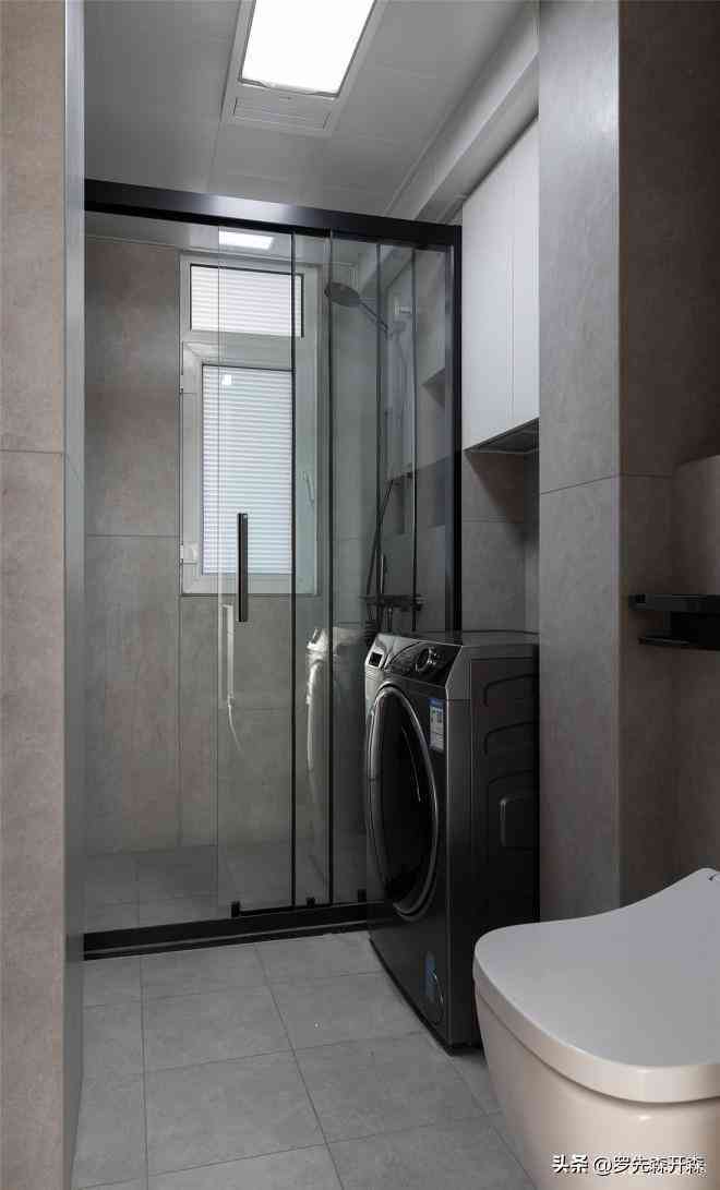 卫生间内部墙地面统一铺贴哑光灰色地砖,耐脏且防滑。透明玻璃移门隔断出一字型的淋浴房,显得尤为通透。洗衣机置于淋浴和马桶之间,机体上方,嵌入式的吊柜,便于囤放日化、清洗用品。#淋浴 #洗衣机 #壁挂马桶 #吊柜