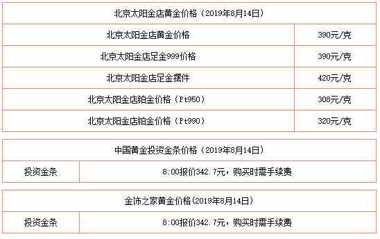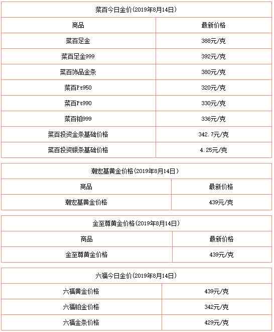 2019年8月14日今日黄金价格今天多少一克查询包括:周生生/周大福/六福珠宝/老庙黄金/老凤祥/菜百/太阳金店/潮宏基/金至尊等品牌999足金价格查询。