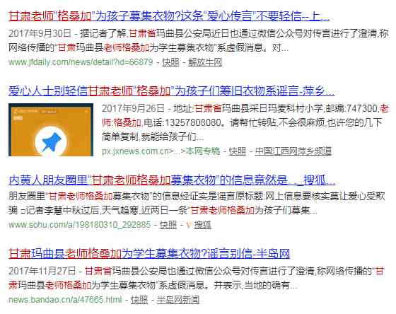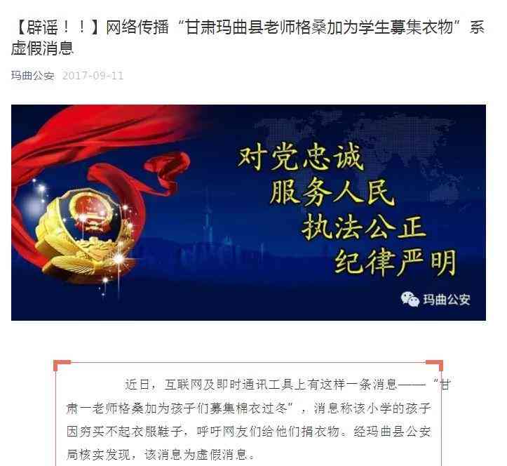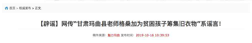 日前,中共玛曲县委宣传部公众号魅力玛曲发文称:网传“甘肃玛曲县老师格桑加为贫困孩子筹集旧衣物”系谣言!