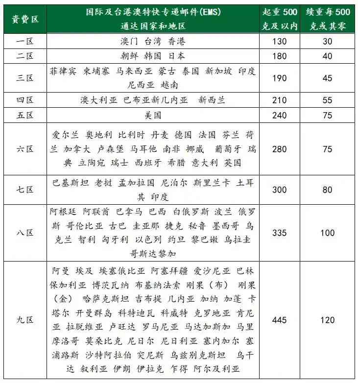 答:个人寄递国际及港澳台EMS业务,参照以下价格表收费:
