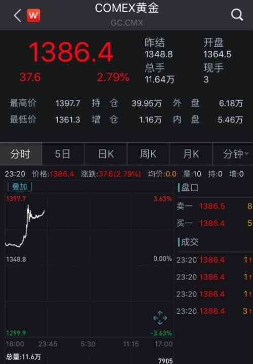 同时,黄金期货也表现活跃。COMEX黄金期货一度上涨至1397.7美元/盎司,创5年新高。截至发稿,COMEX黄金涨幅2.79%,报1386.4美元/盎司。