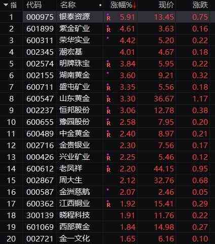 还有,紫金矿业、潮宏基、明牌珠宝、山东黄金、湖南黄金、中金黄金等多只个股均有明显拉升。