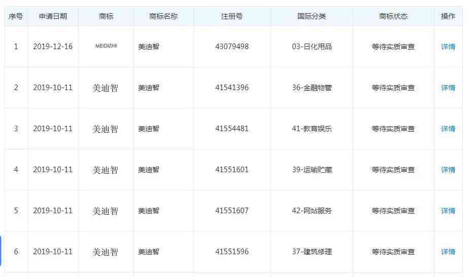公司旗下品牌美迪智在2019年多次申请商标注册,分类分别为日化用品、金融管理、教育娱乐、运输储藏、网站服务、建筑修理、通讯服务、材料加工、餐饮住宿、社会服务等。最近一次申请日期为2019年12月16日,其商标状态都显示的是“等待实质审查”。