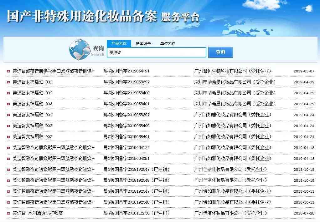 颜值君在国产非特殊用途化妆品备案服务平台查到,美迪智2017年至2018年备案信息均为已注销状态。其委托企业为诗如雅,受托企业有广州百媚化妆品有限公司、广州德芙化妆品有限公司、广州佳洁化妆品有限公司、深圳市萨希曼化妆品有限公司、楚业健康产业(广州)有限公司、广州均衡生物科技有限公司、广州东智盟化妆品有限公司、广州迦心化妆品有限公司。值得一提的是,除楚业健康产业(广州)有限公司外,其余几家公司都有不同程度的行政处罚。