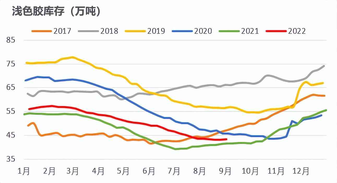 浅色累库预期少于去年。目前浅色胶库存接近去年同期,而后市对于全乳胶有一定的减产预期,而3L胶今年由于浓乳分流的原因,从库存来看同样累库速度较慢,因此浅色胶四季度的累库预期少于去年。