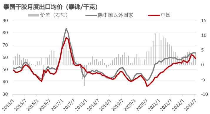 海外标胶需求仍然强势,海外仍然存在溢价。从泰国海关数据来看,7月出口至海外数量环比大幅增加,从出口均价来看海外仍然卖出溢价。