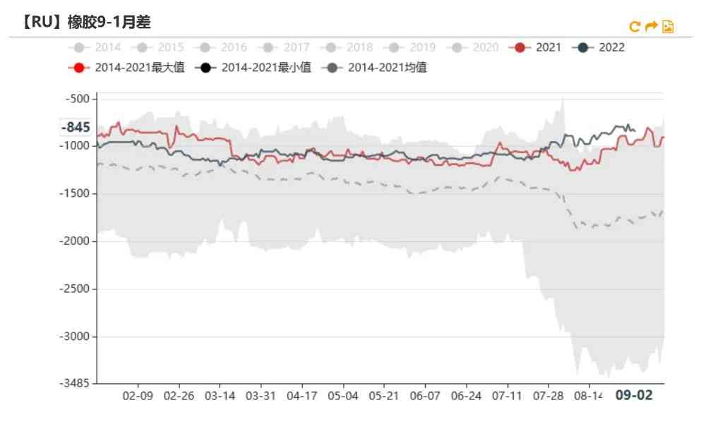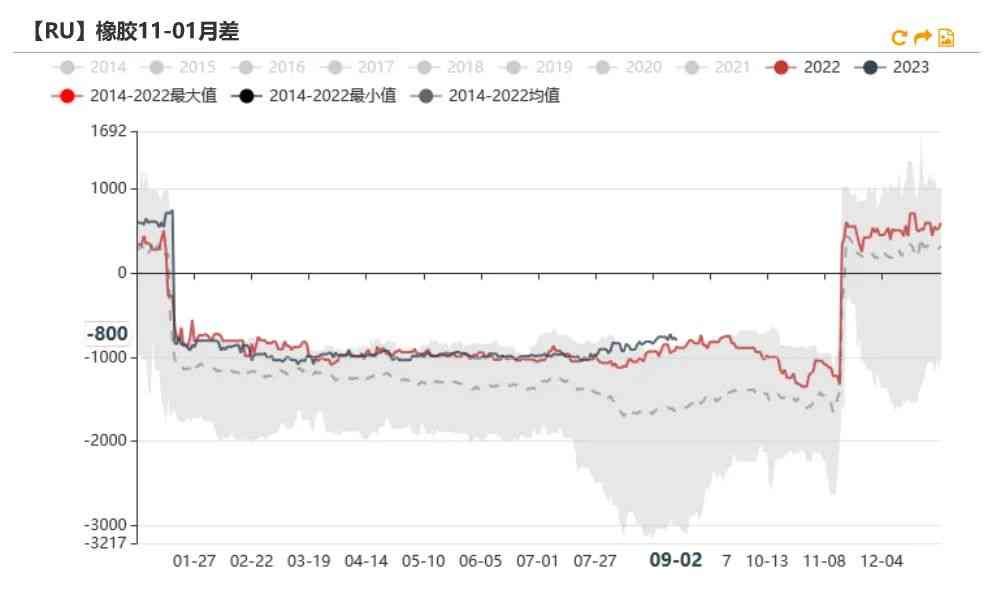 9月2日RU11-01月差为-800元/吨,较上周下跌40元/吨。RU09-01月差为-845元/吨,较上周下跌50元/吨。