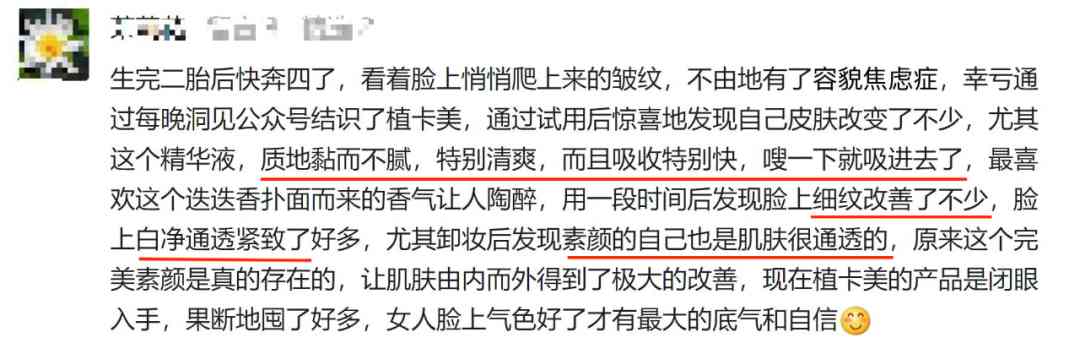 图源@咸鱼DS@格纹thus,28岁,白领工作者平时经常加班熬夜,皮肤常常干到爆细纹,法令纹、眼下纹也是重的不行,看起来又丑又显老…. 在闺蜜推荐下试用了植卡美这款精华液后,整个人看起来年轻了很多。昨天还被女领导追着问,最近怎么保养的,状态好了这么多……
